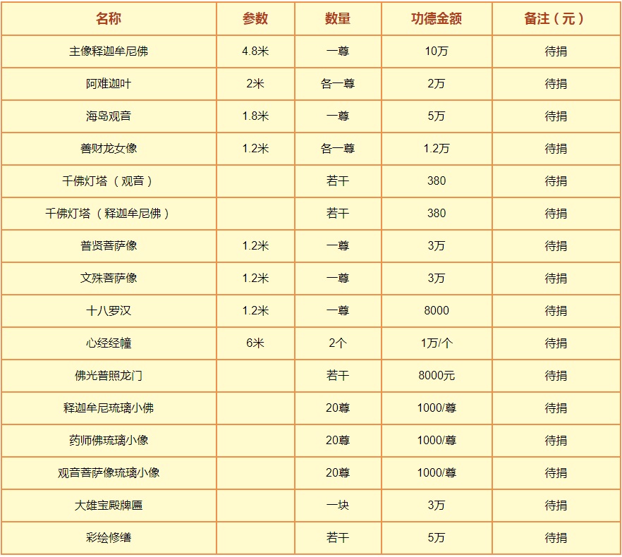 世间福报来说,捐善款助建大雄宝殿,是敬仰三宝,必蒙诸佛菩萨加被,消灾赐福,福慧增长;寺院令修行者身心安稳、免于颠簸流浪,故可得生活安稳、住所如意报;有意乐捐款、捐物者等不论多少,不论大小,将留名造册,获造佛功德。寺里的法师会时时为各位功德主念经回向祈福,并祈祷十方诸佛菩萨,龙天护法保佑,诚祈十方大德善信随喜发心,共同完成此愿。共植菩提胜因,圆满无上功德。